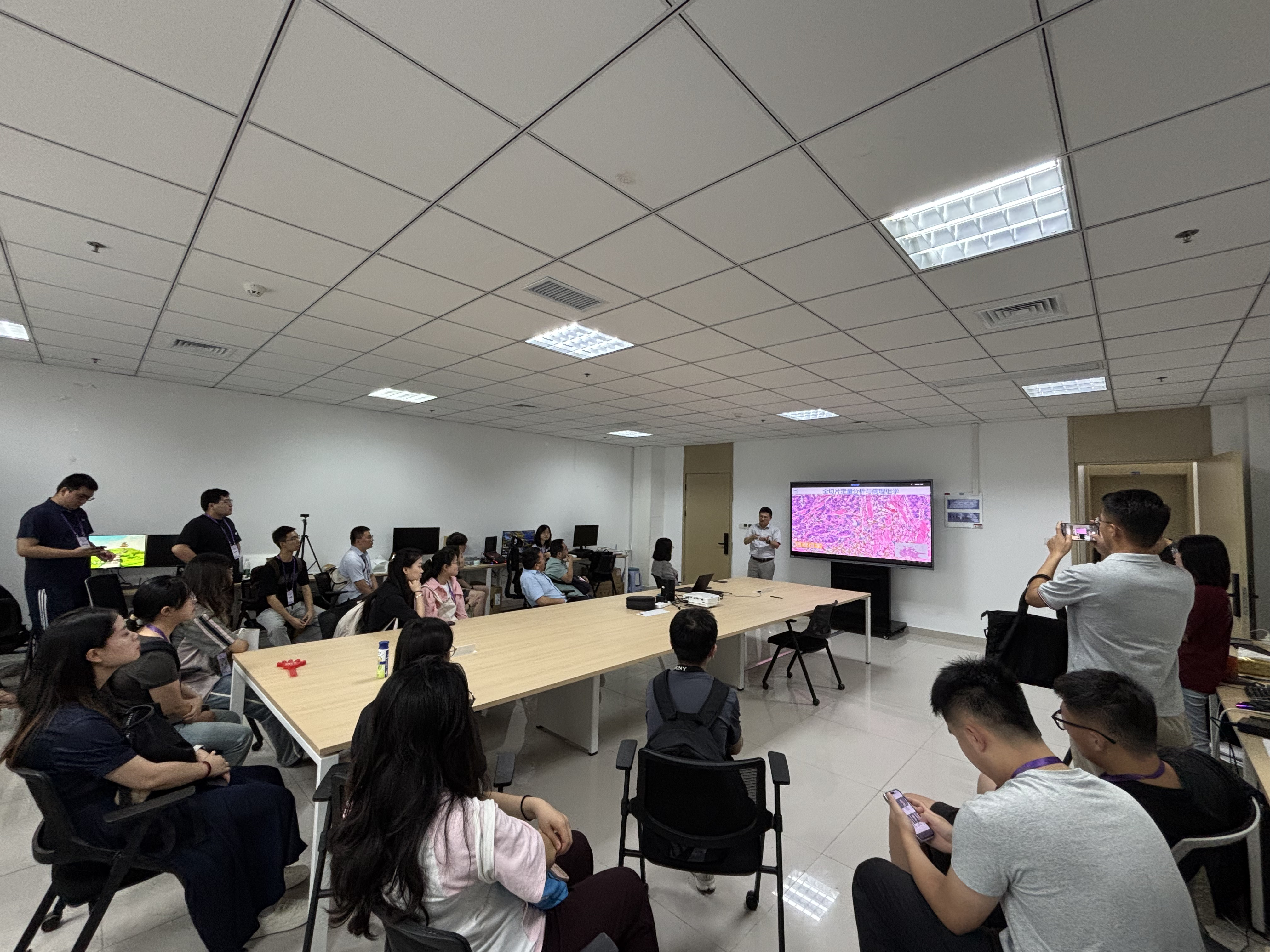 随后,徐军向学员们系统介绍了IMIC实验室的五大核心研究方向。在他的引导下,学员们实地观摩了实验室的高通量病理切片扫描仪和微米级OCT成像设备等先进科研装置。徐军详细讲解了实验室在计算病理、医学成像技术、多模态生理信号分析、智能医学影像解析和脑科学研究等领域的最新突破。