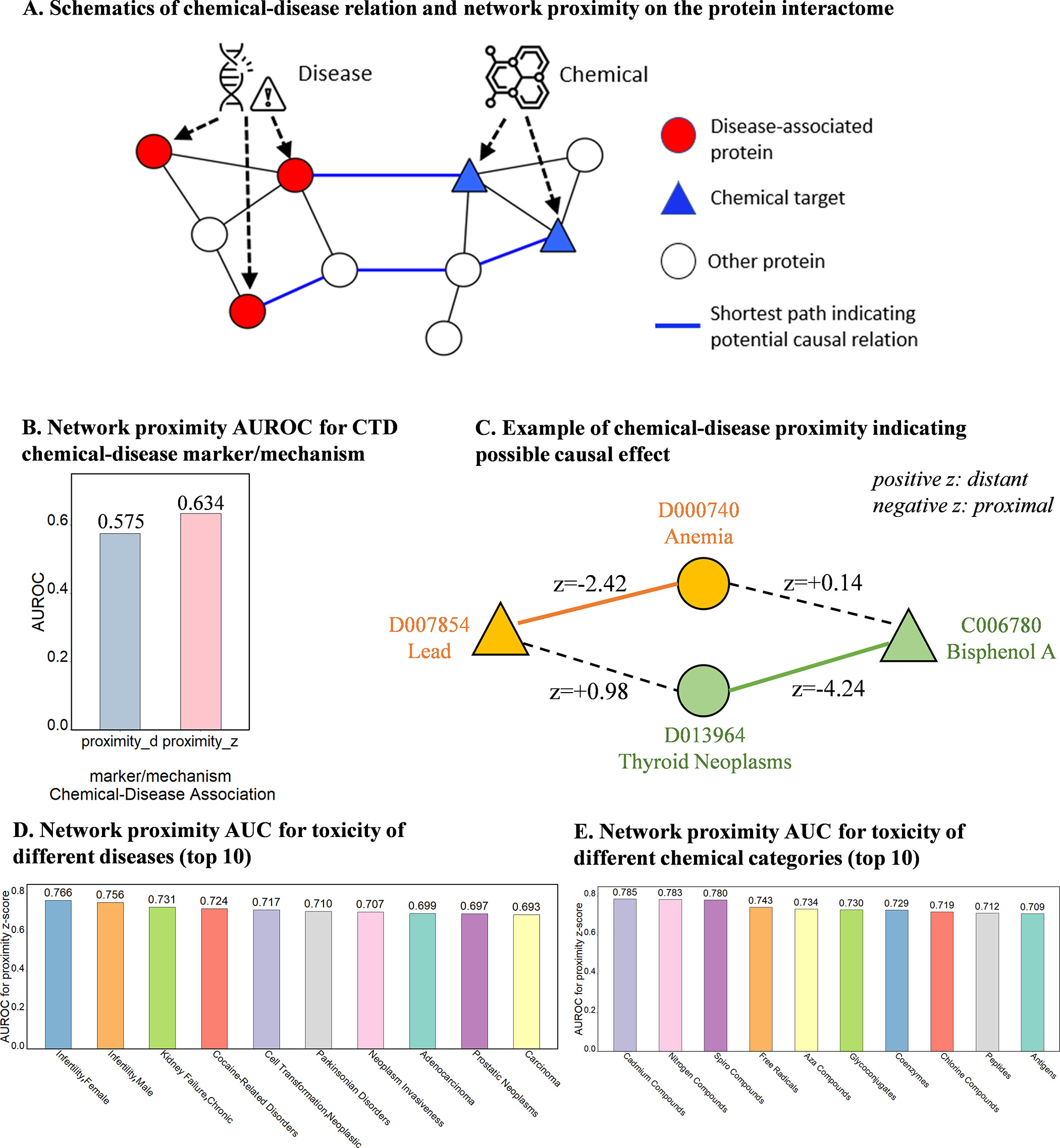 甘晓教授和高北副教授联合团队在此论文中提出基于人类蛋白质互作网络的理论框架,揭示化学药品毒性可由化合物靶标与疾病关联蛋白模块的拓扑邻近关系给出普遍性的解释。论文首先提出,化学品靶标与疾病关联蛋白在人类PPI网络上越邻近,化学品越易诱发该疾病,并通过比较毒理基因组数据库(CTD)的3679种化学品与280种疾病数据,系统验证了网络邻近性对化学品-疾病关联具有通用性较强的预测能力,整体AUROC显著优于随机水平,且对99.3%的疾病和98.7%的化学品类别具有预测能力,最高AUROC达0.79。