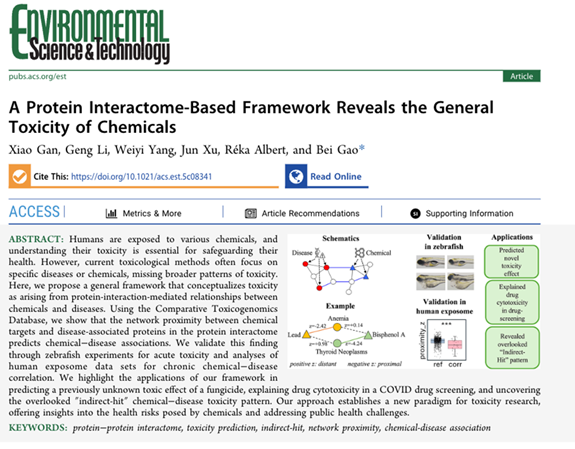 近日,南京信息工程大学人工智能学院智能医学图像计算江苏高校重点实验室甘晓教授和环境科学与工程学院高北副教授多学科交叉团队合作在环境科学领域顶级期刊 Environmental Science & Technology(中科院一区 Top 期刊,影响因子 IF=11.3)发表题为 “A Protein Interactome-Based Framework Reveals the General Toxicity of Chemicals(基于蛋白质相互作用组的框架揭示了化学物质的总体毒性)” 的研究论文。该论文建立了基于人类蛋白质互作网络(PPI)的化学药品共性毒理理论和毒性预测方法,首次从系统层面揭示化学品引起疾病的共性规律,建立了全新的多学科交叉毒理学研究范式。