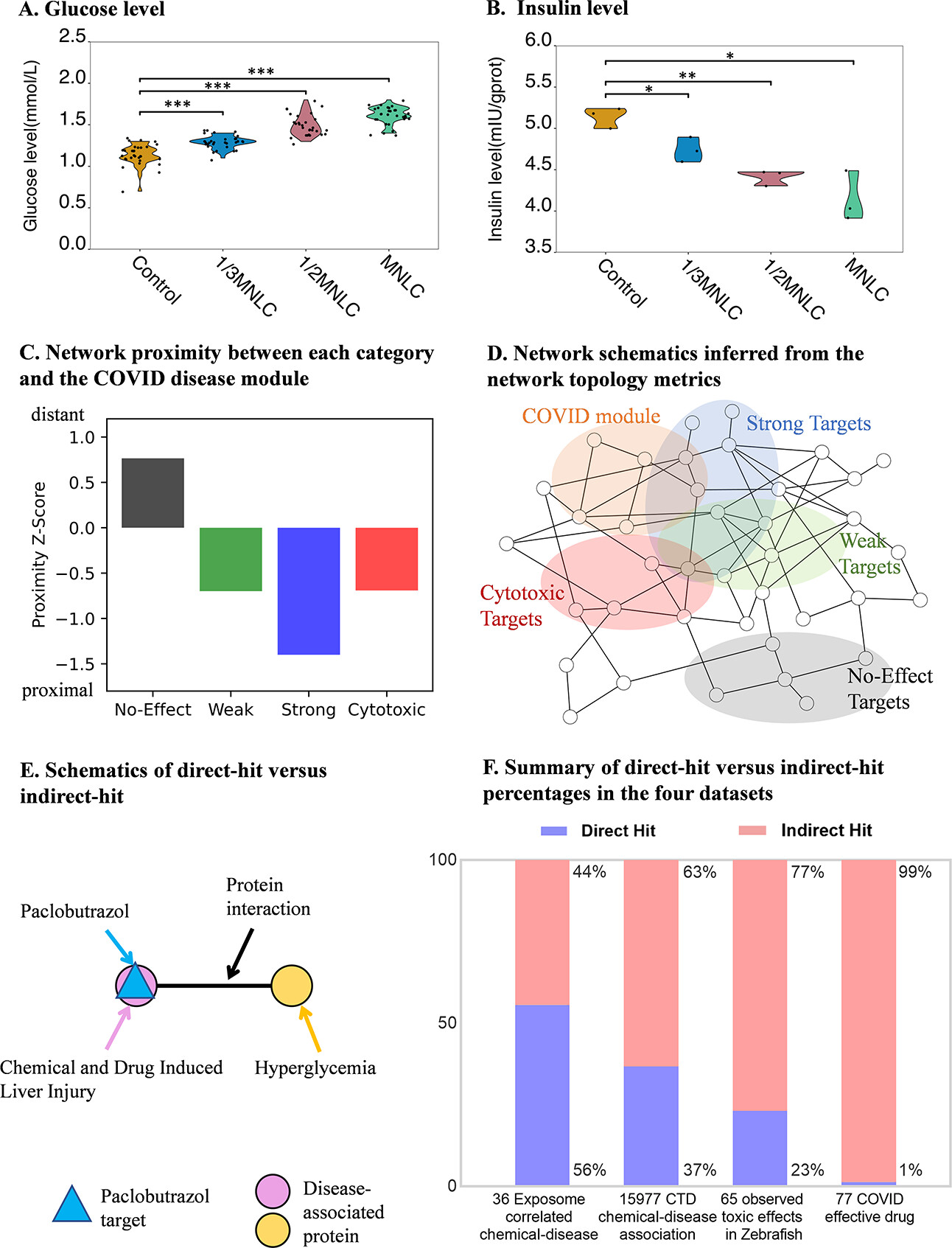 然后,论文通过应用网络邻近规律进行预测,首次揭示多效唑(paclobutrazol)具备升高血糖、降低胰岛素的毒性,证明PPI可以作为发现化学品新毒性的有效工具。同时,应用网络邻近规律能够解释COVID药物实验中的呈现毒性的药物。最后,论文证实基于网络邻近规律的化学品-毒性预测方法能够成功捕捉“间接命中”(indirect hit)的毒理/药理模式,阐明当前常用的针对特定靶标的筛选研究方法并不能捕捉大部分毒理和药理,表明基于网络间接关系方法的毒理/药理研究方法的优越性。以上应用证明该论文提出的理论框架在化学品健康风险评估、药物安全评价方向具备显著应用潜力。