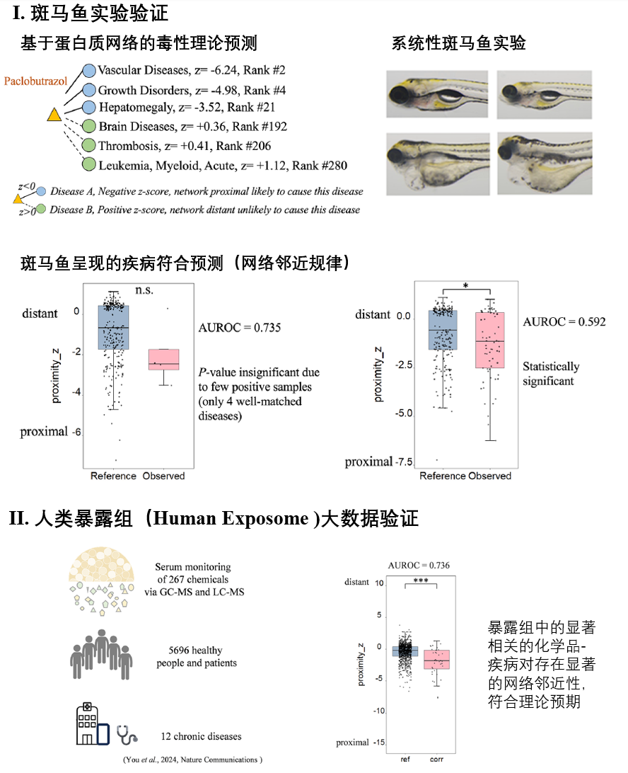 随后,论文以多效唑(paclobutrazol,一种农药)为例,通过斑马鱼急性毒性实验,验证其形态异常与网络预测疾病的高度吻合,证实理论框架对急性毒性的准确预测作用。同时,论文通过人类暴露组(Human Exposome)数据分析,证实36组具备显著相关性的化学品-慢性疾病对符合网络邻近规律,系统验证了本文理论框架对慢性疾病的有效性。